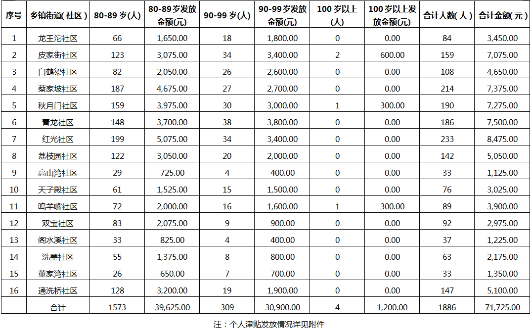 涪陵区崇义街道2025年11月高龄津贴明细及汇总表