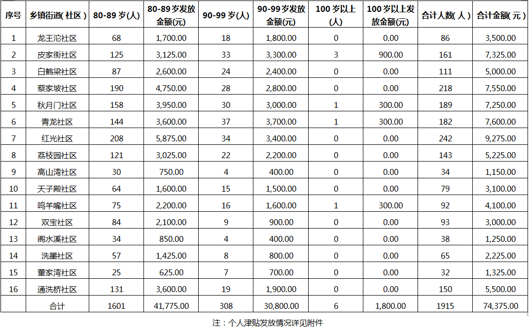 涪陵区崇义街道2026年1月高龄津贴明细及汇总表