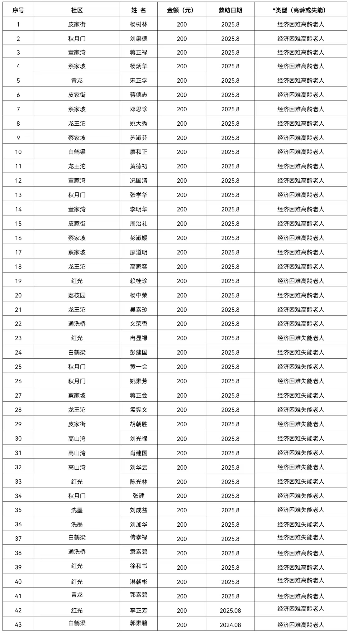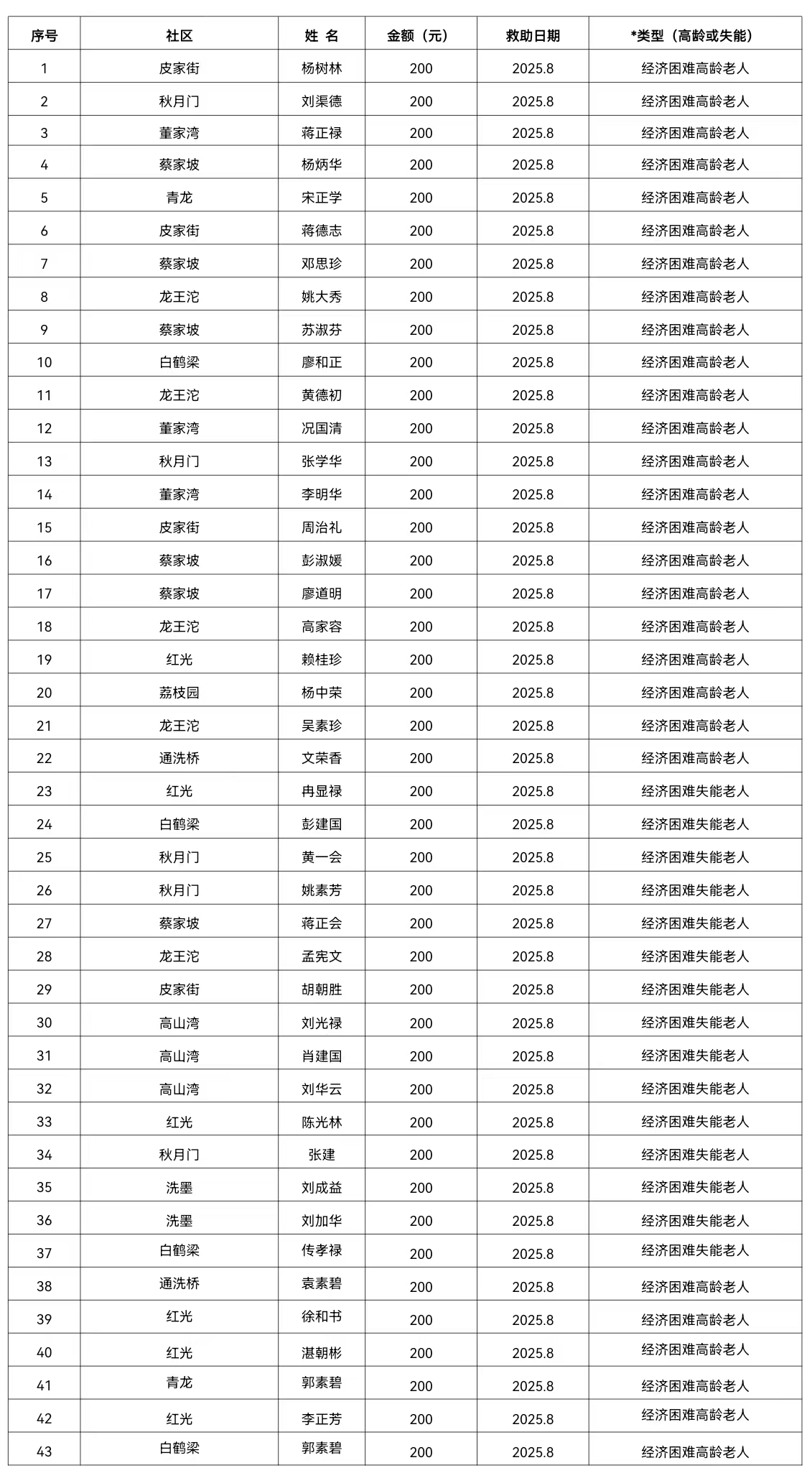 2025年8月涪陵区崇义街道经济困难高龄失能老年人养老服务补贴名单