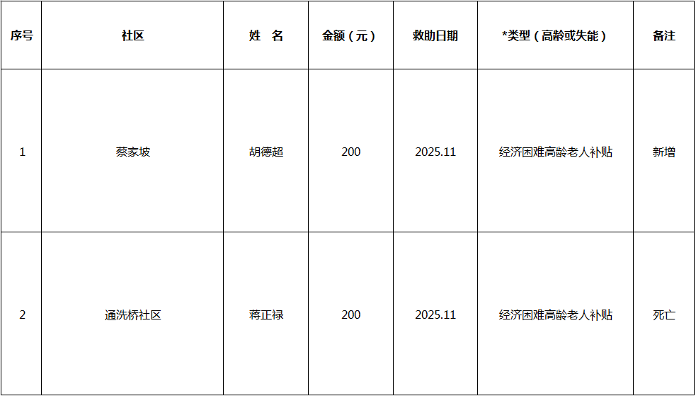 2025年11月涪陵区崇义街道经济困难高龄失能老年人养老服务补贴新增、停发名单