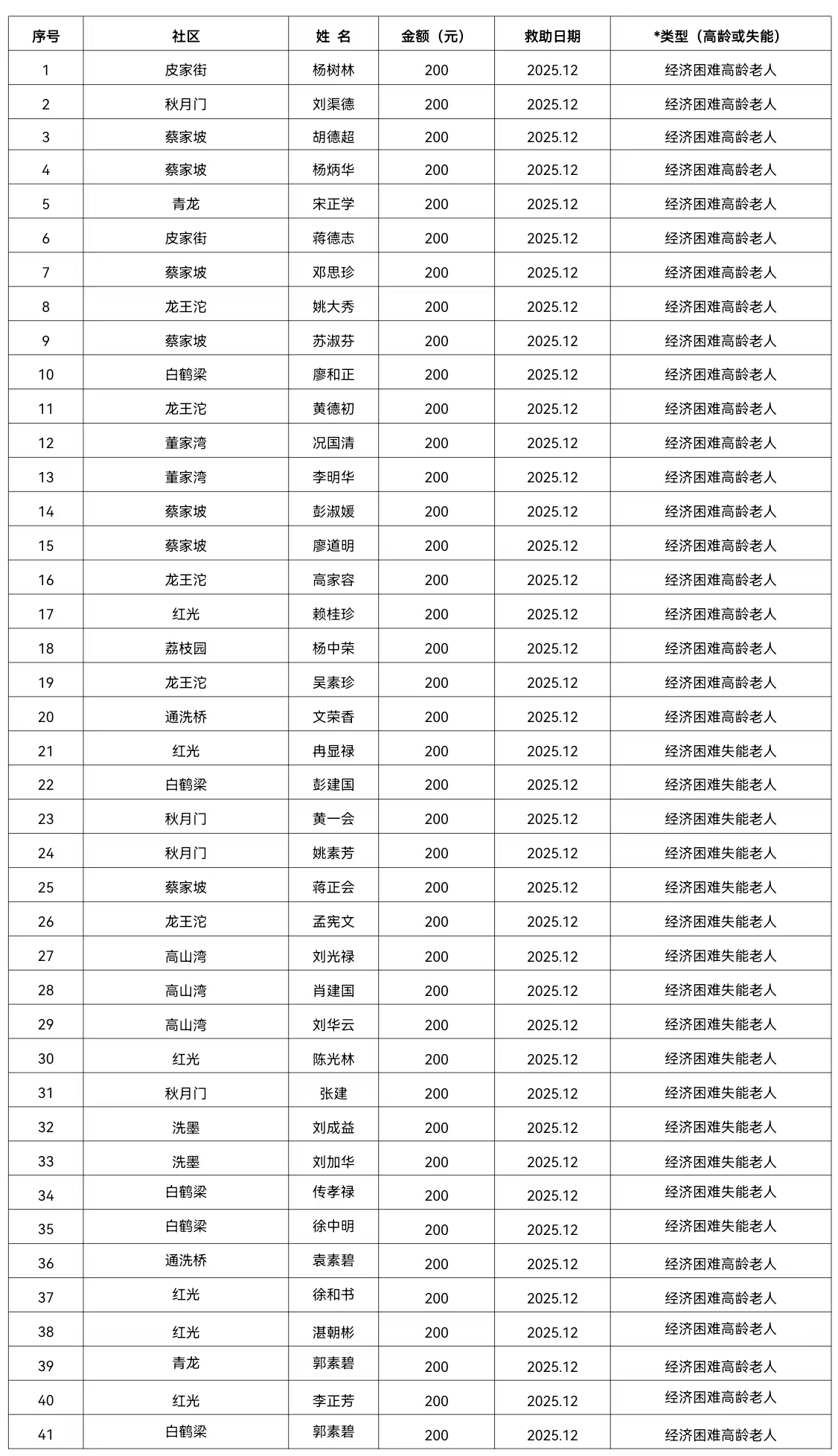 2025年12月涪陵区崇义街道经济困难高龄失能老年人养老服务补贴名单