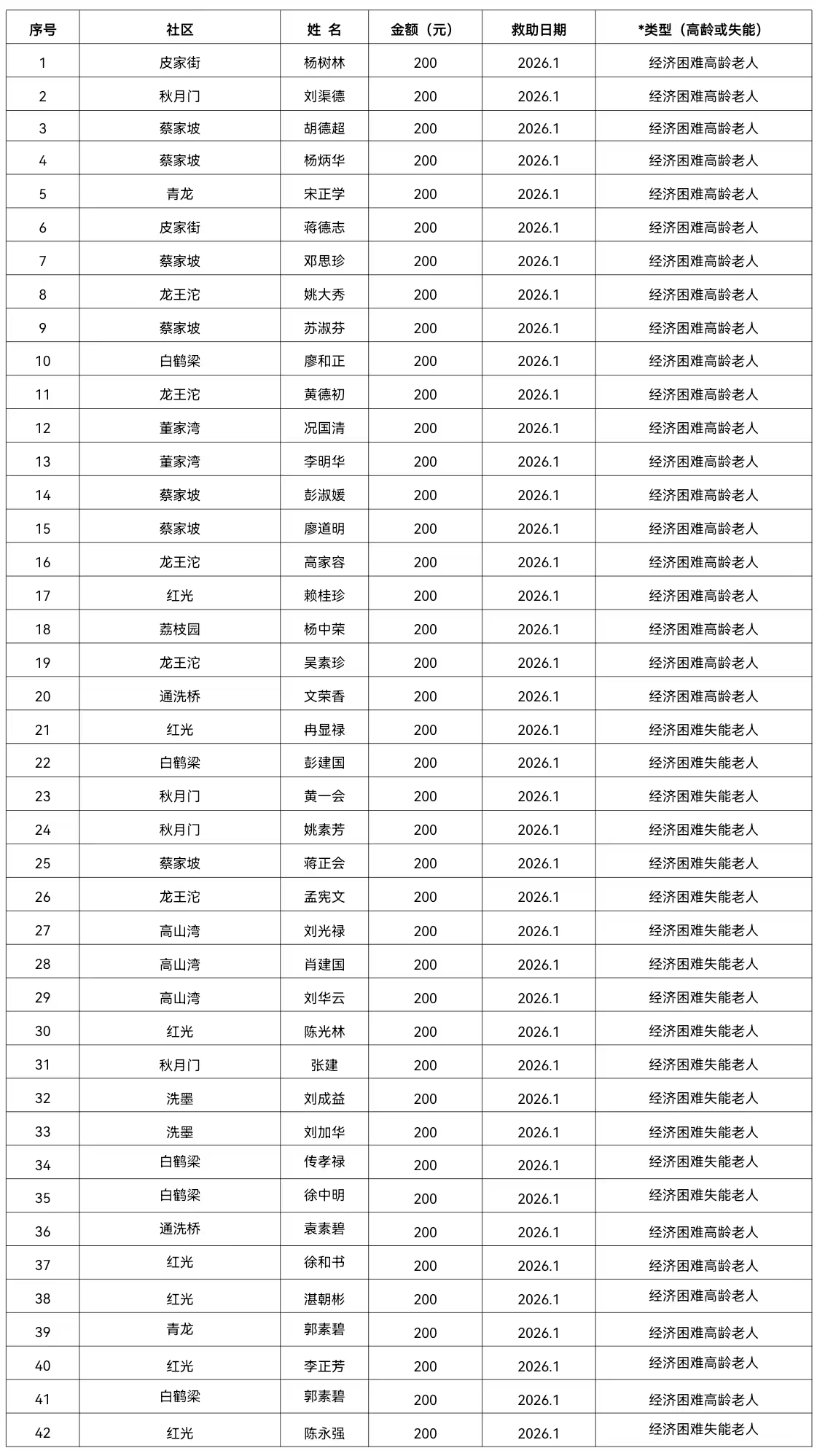 2026年1月涪陵区崇义街道经济困难高龄失能老年人养老服务补贴名单
