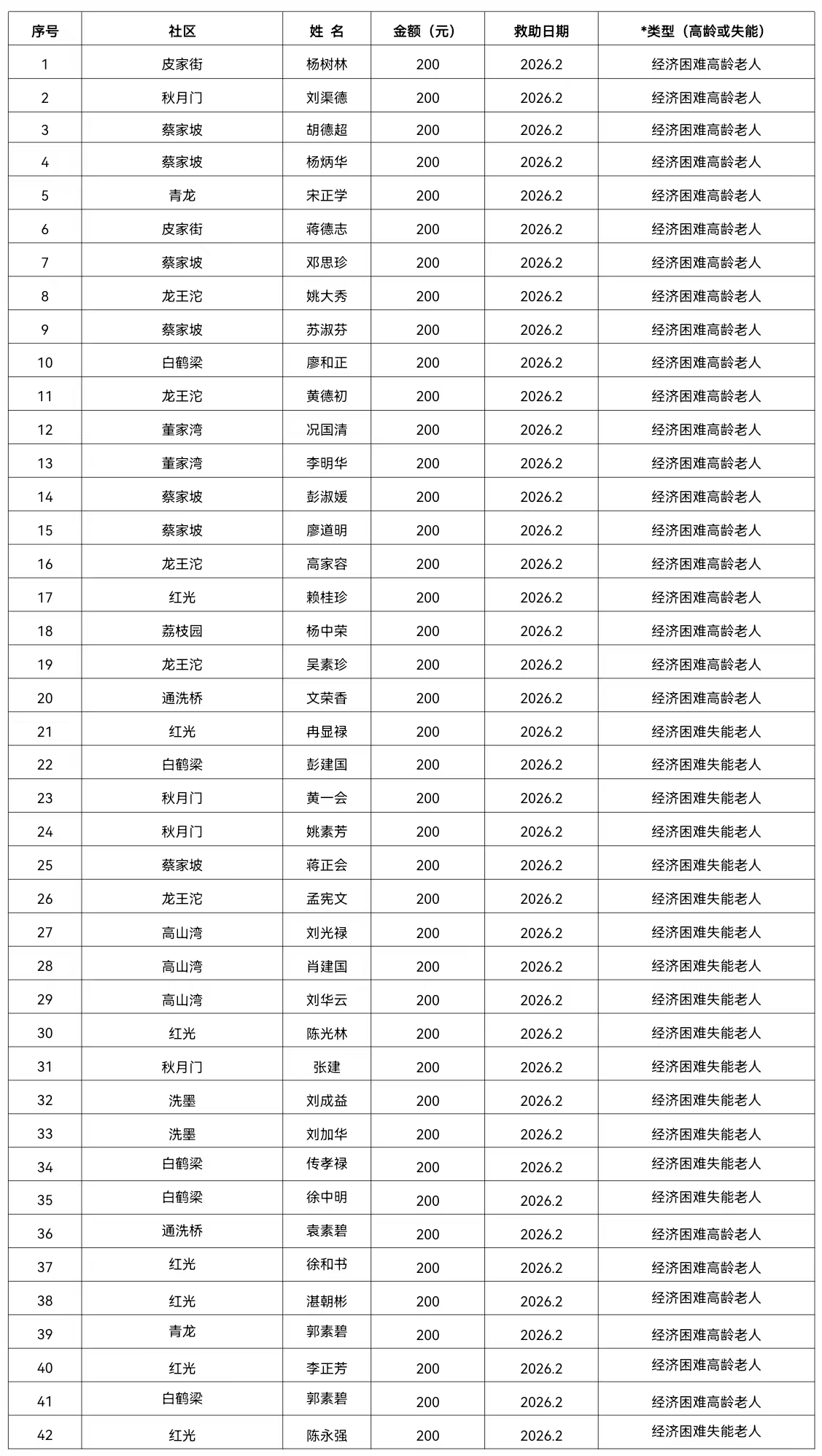 2026年2月涪陵区崇义街道经济困难高龄失能老年人养老服务补贴名单