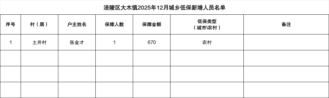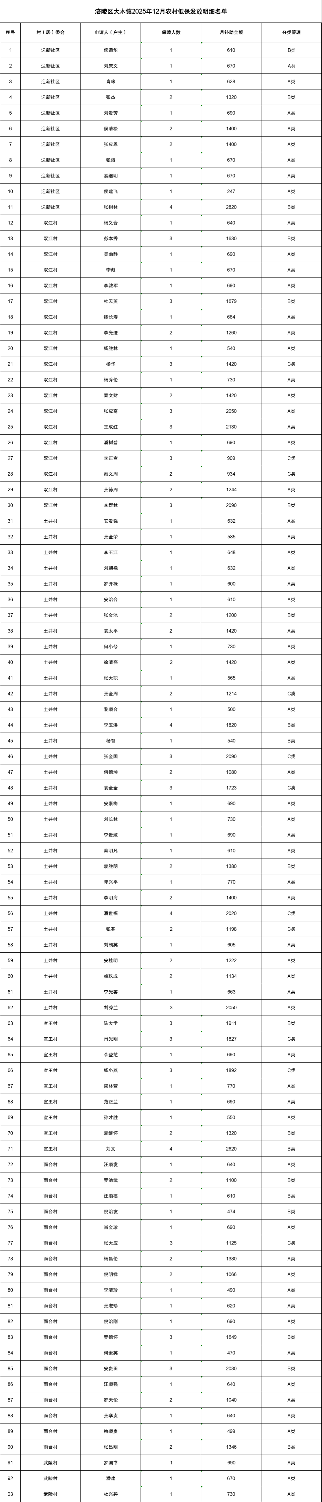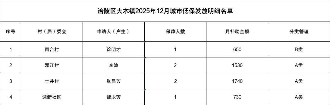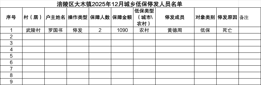 涪陵区大木镇2025年12月城乡低保新增、停发及个人发放明细表