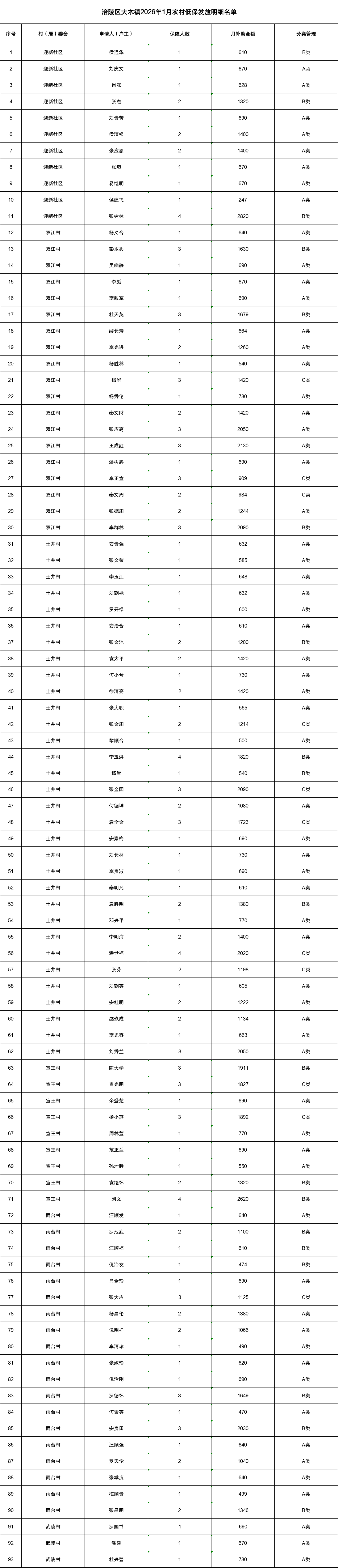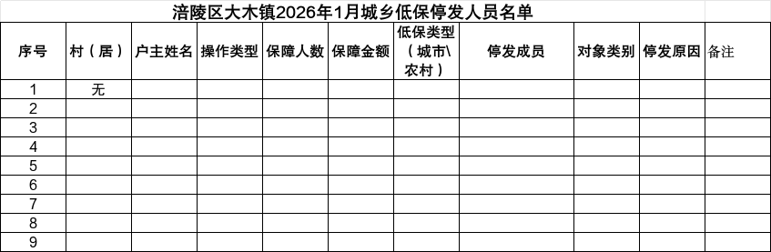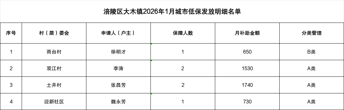 涪陵区大木镇2026年1月城乡低保新增、停发及个人发放明细表