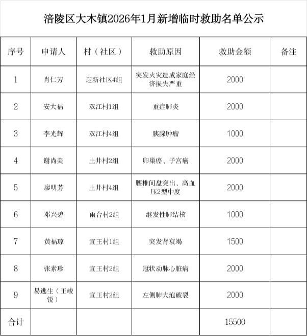 涪陵区大木镇2026年1月临时救助审核结果