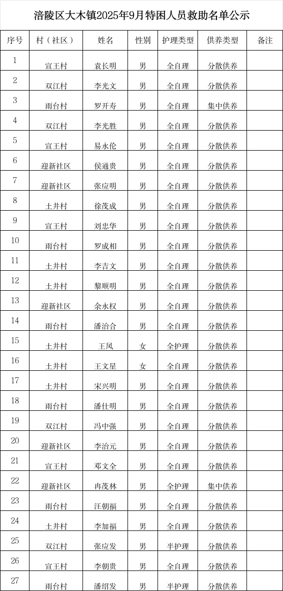 涪陵区大木镇2025年9月特困人员救助名单公示