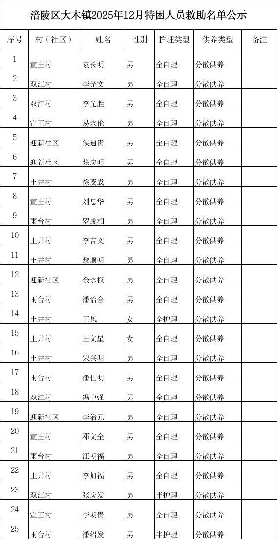 涪陵区大木镇2025年12月特困人员救助名单公示
