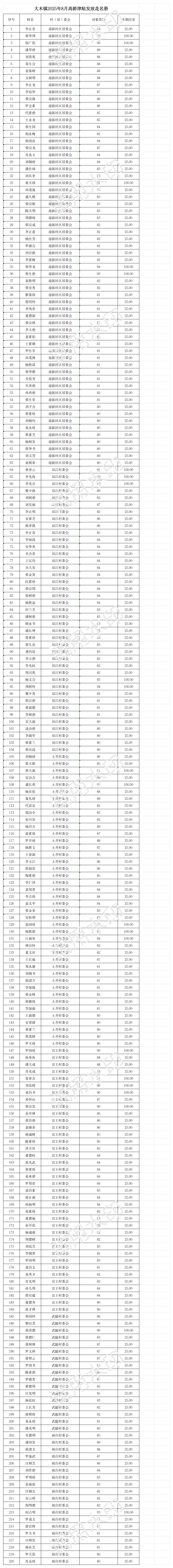 涪陵区大木镇2025年8月高龄津贴发放金额汇总表