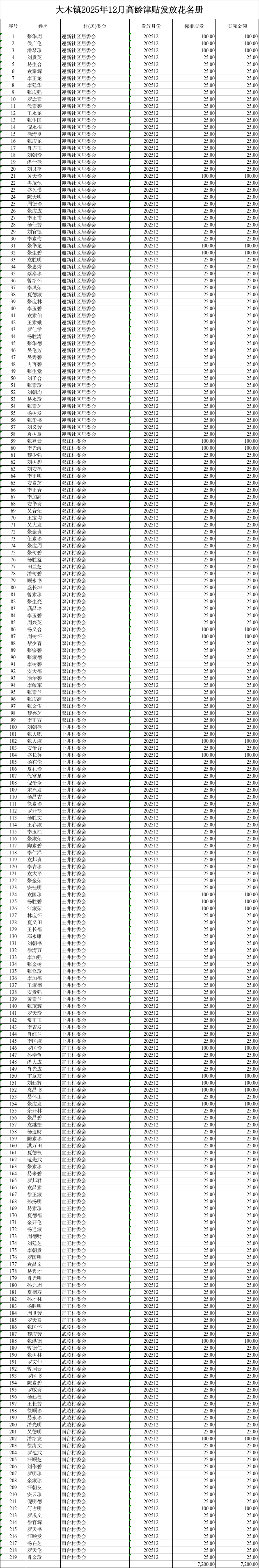 涪陵区大木镇2025年12月高龄津贴发放金额汇总表