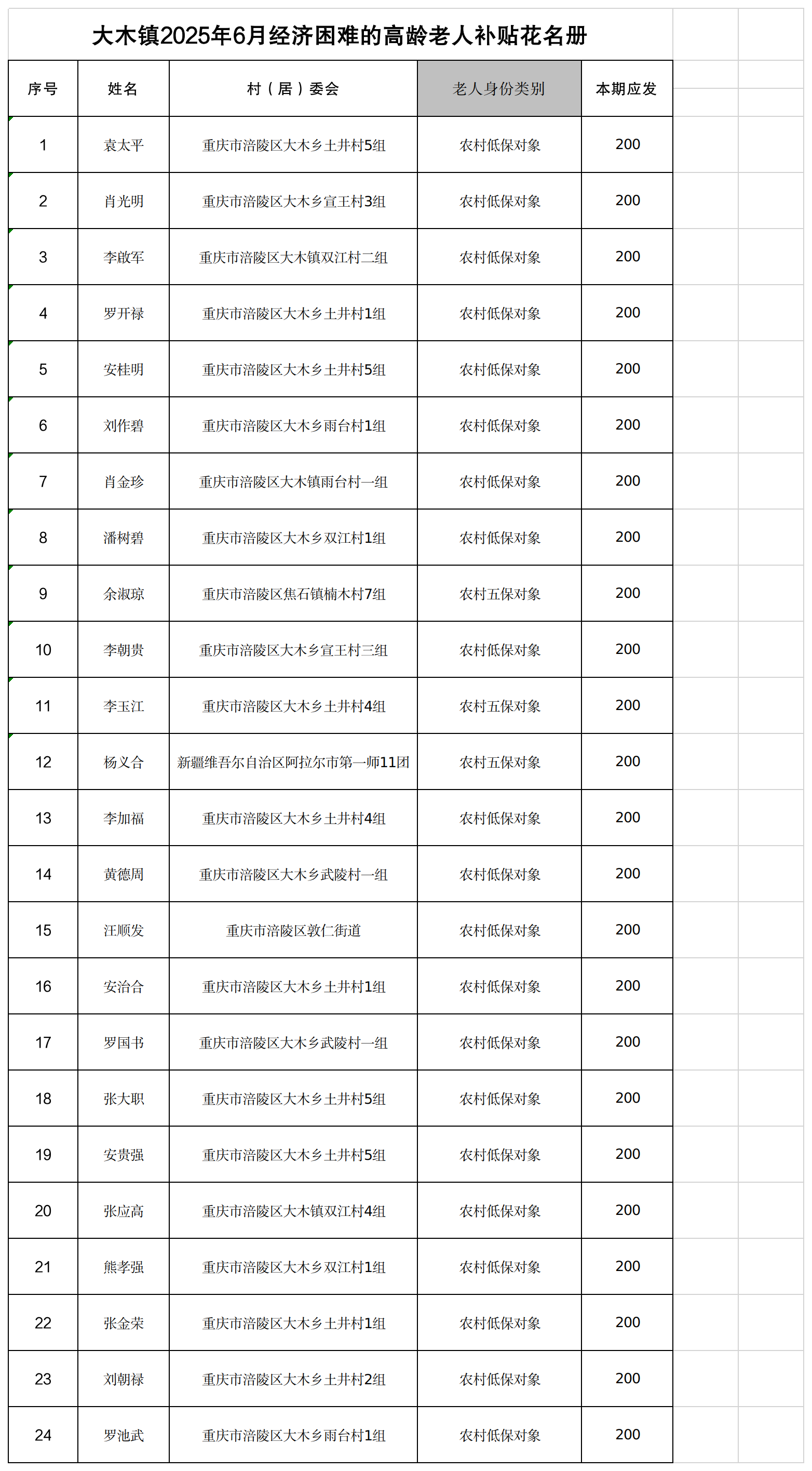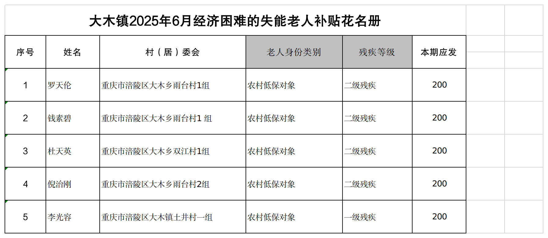 涪陵区大木镇2025年6月经济困难高龄失能老年人养老服务补贴名单