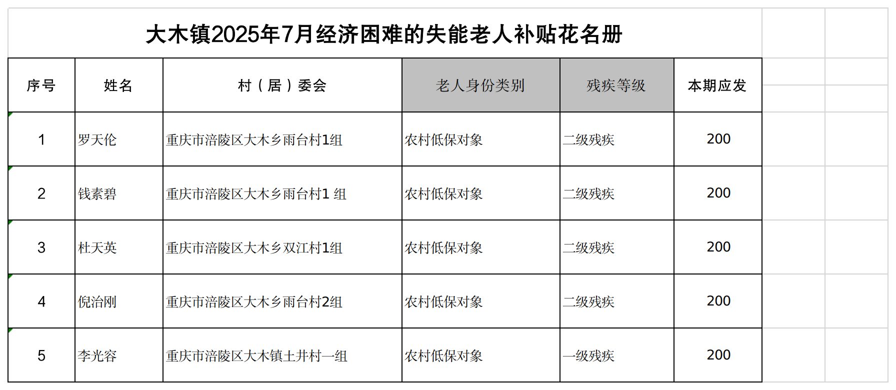 涪陵区大木镇2025年7月经济困难高龄失能老年人养老服务补贴名单