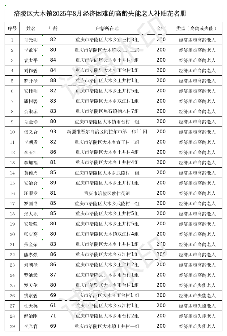 涪陵区大木镇2025年8月经济困难高龄失能老年人养老服务补贴名单