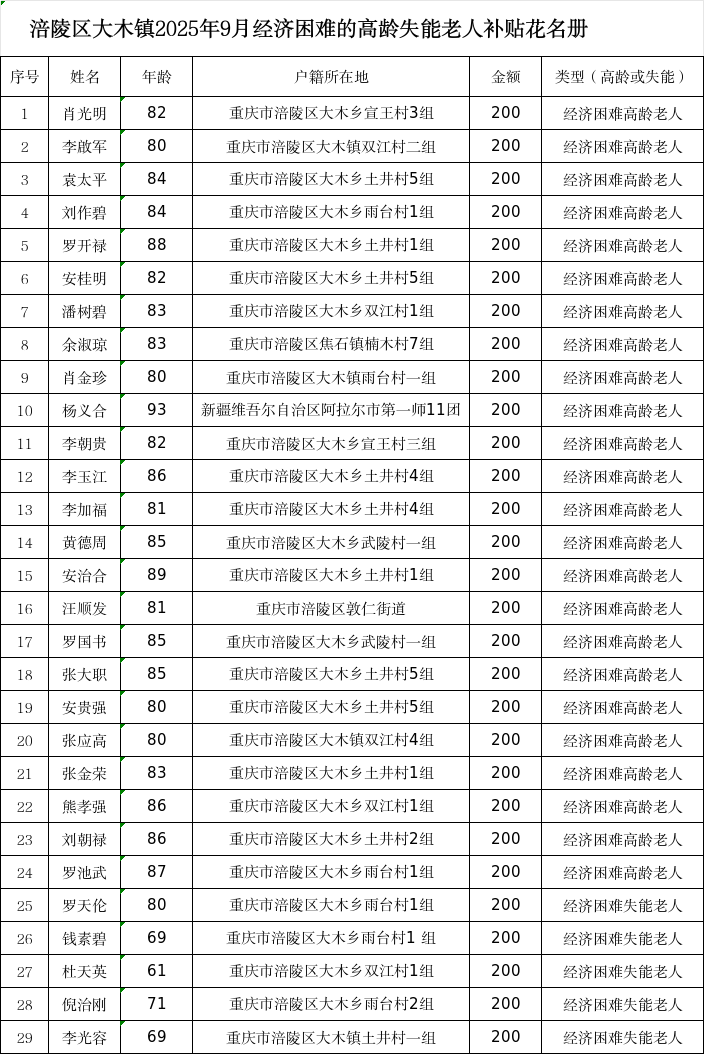 涪陵区大木镇2025年9月经济困难高龄失能老年人养老服务补贴名单