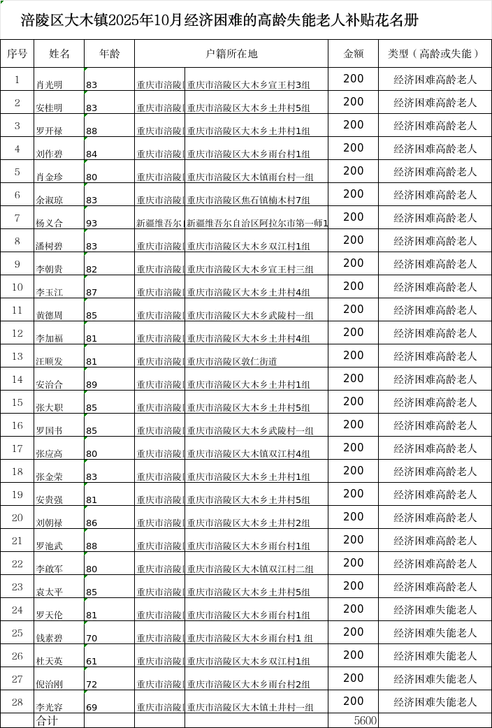 涪陵区大木镇2025年10月经济困难高龄失能老年人养老服务补贴名单