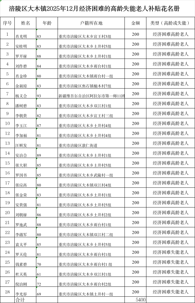 涪陵区大木镇2025年12月经济困难高龄失能老年人养老服务补贴名单