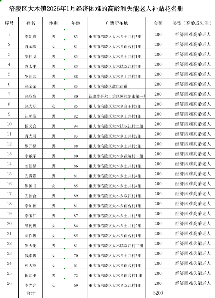 涪陵区大木镇2026年1月经济困难高龄失能老年人养老服务补贴名单