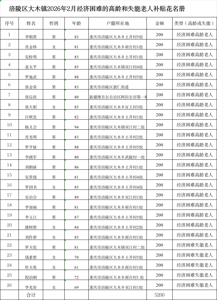 涪陵区大木镇2026年2月经济困难高龄失能老年人养老服务补贴名单