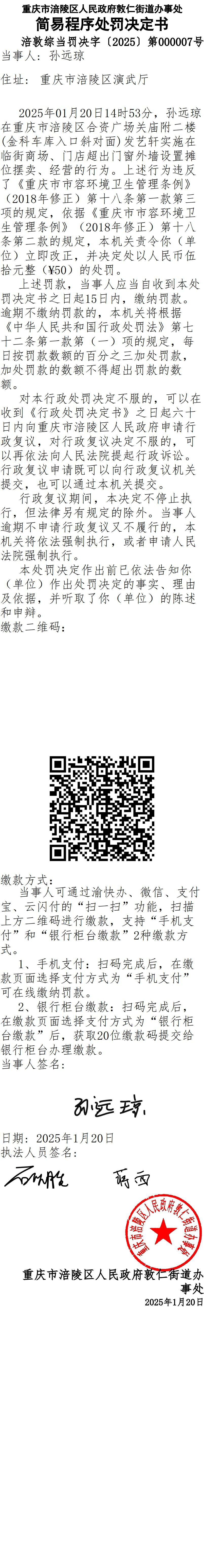 重庆市涪陵区人民政府敦仁街道办事处简易程序处罚决定书