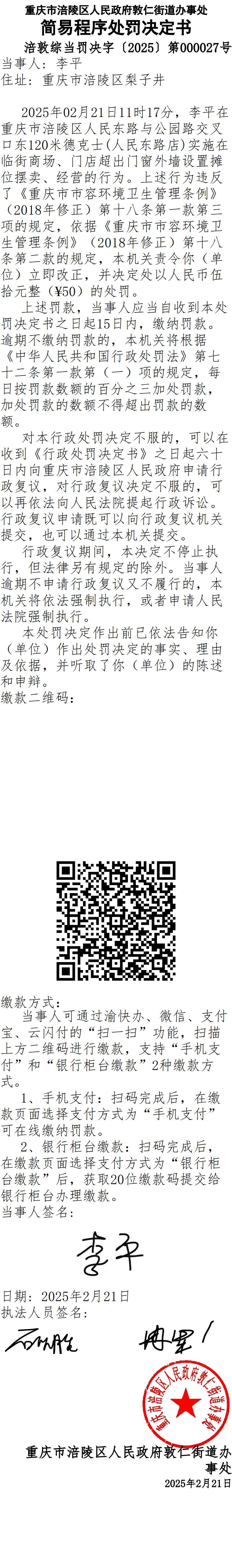 重庆市涪陵区人民政府敦仁街道办事处简易程序处罚决定书