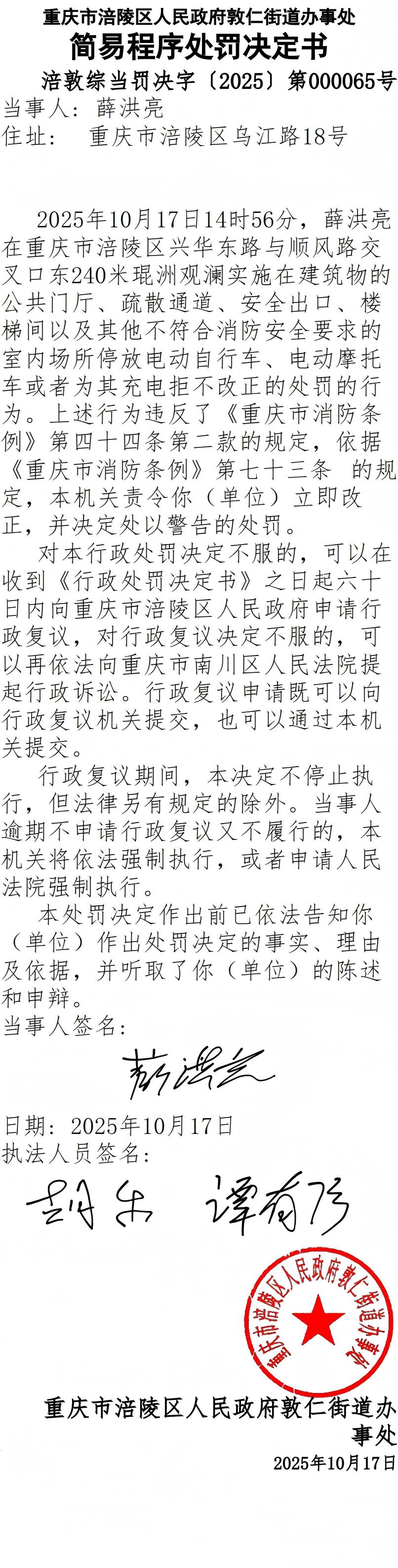 重庆市涪陵区人民政府敦仁街道办事处简易程序处罚决定书