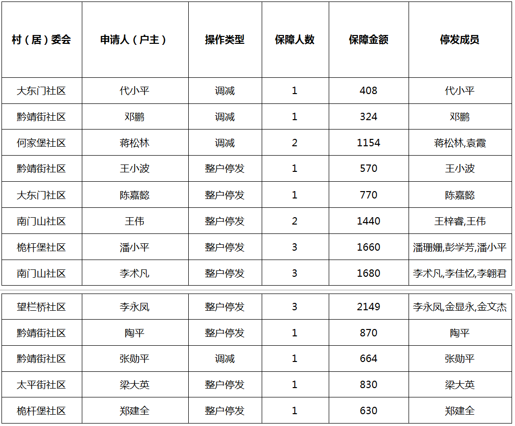 涪陵区敦仁街道2025年10月低保人员调减、停发名单