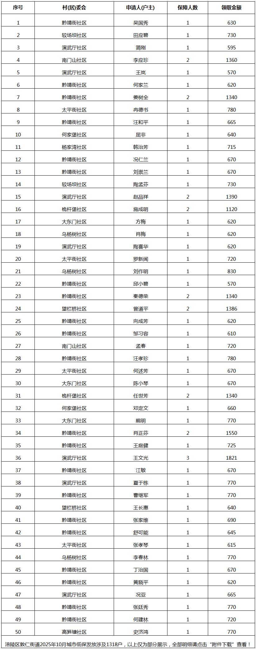 涪陵区敦仁街道2025年10月城市低保个人发放明细表