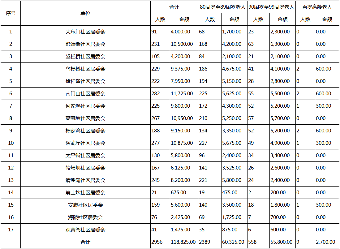 涪陵区敦仁街道2026年1月高龄津贴发放金额汇总表