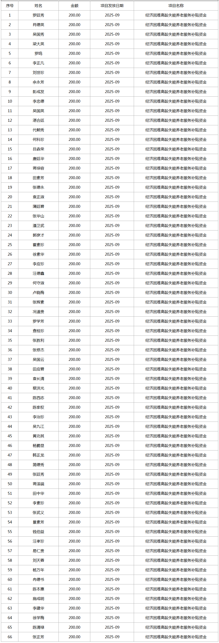 涪陵区敦仁街道2025年9月经济困难高龄失能老人养老服务补贴名单