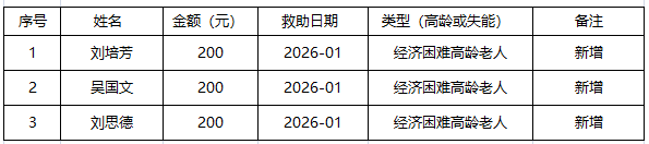 2026年1月涪陵区敦仁街道经济困难高龄失能老年人养老服务补贴新增、停发名单