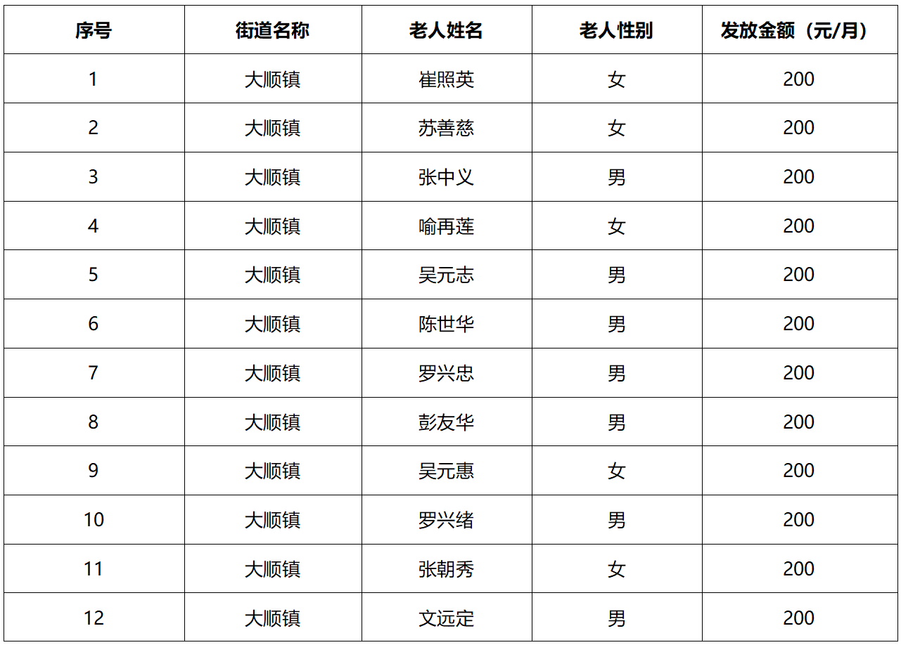 涪陵区大顺镇2026年1月经济困难失能老人补贴