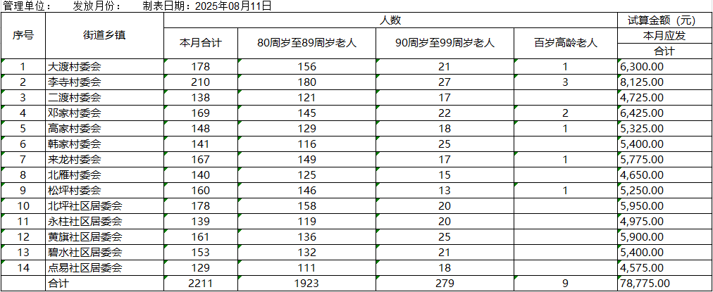 涪陵区江北街道高龄津贴发放情况(2025年8月)