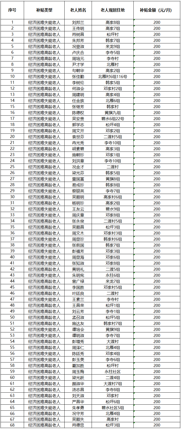 涪陵区江北街道2025年9月经济困难的高龄失能老年人养老服务补贴发放花名册