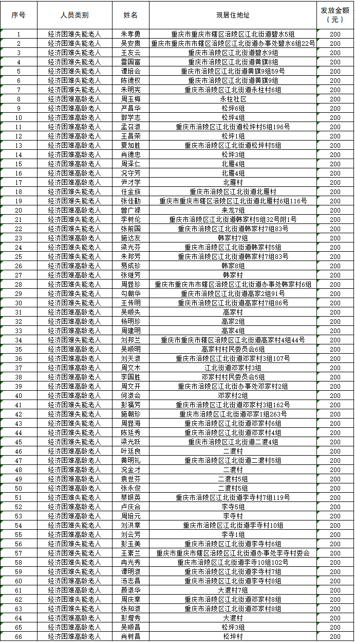涪陵区江北街道2026年1月经济困难的高龄失能老年人养老服务补贴发放花名册