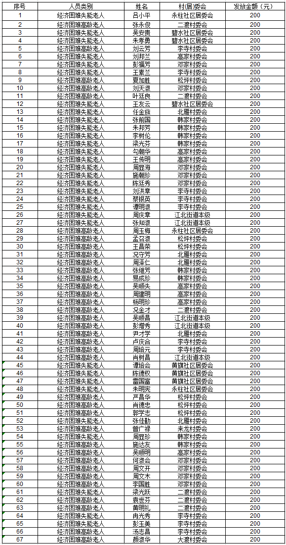 涪陵区江北街道2026年3月经济困难的高龄失能老年人养老服务补贴发放花名册