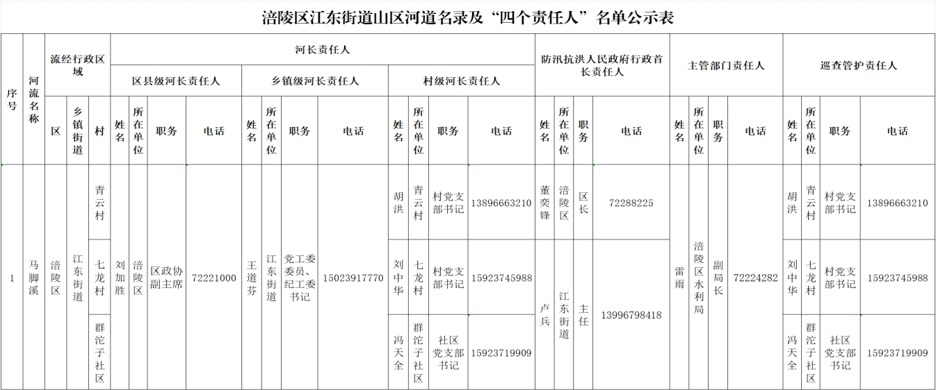 涪陵区江东街道山区河道名录及“四个责任人”名单公示表