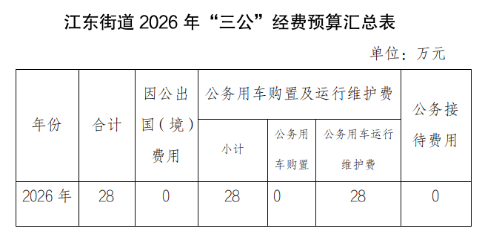 按照市政府、区政府关于推进政府信息公开工作部署和要求, 2026年我街道一般公共预算“三公”经费支出预算为28万元,其中:因公出国(境)费用0万元,公务用车购置及运行维护费28万元,公务接待费0万元。与2025年预算相比,2026年一般公共预算“三公”经费支出预算无增减。