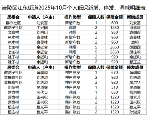 涪陵区江东街道2025年10月低保人员新增、停发、调减公示