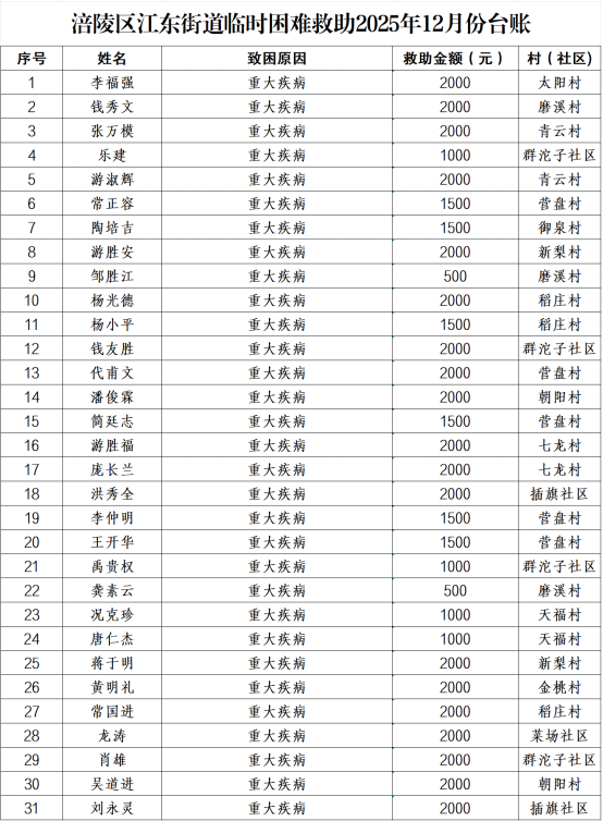 涪陵区江东街道临时困难救助2025年12月台账