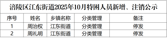 涪陵区江东街道2025年10月特困人员新增、注销公示