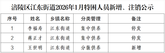 涪陵区江东街道2026年1月特困人员新增、注销公示