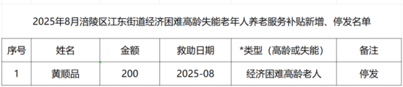 2025年8月涪陵区江东街道经济困难高龄失能老年人养老服务补贴新增、停发名单