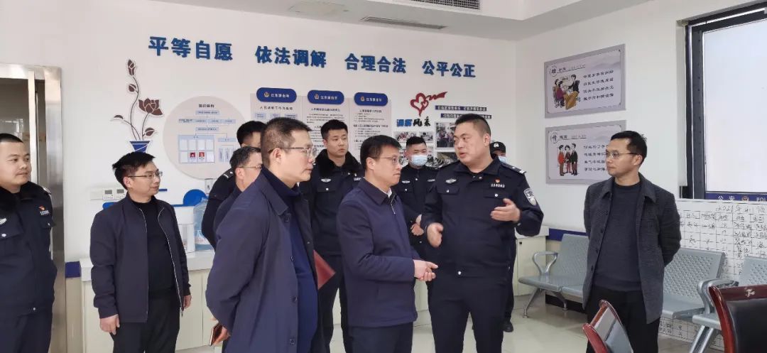 谢成洪常委一行首先来到江东派出所,详细了解江东派出所队伍建设、辖区全国两会期间社会面治安防控、安保维稳、重点人员管控等工作情况。实地查看人民调解驻派出所调解室工作开展情况,了解工作机制、运行模式以及遇到的困难和问题。