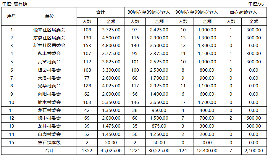 涪陵区焦石镇高龄津贴发放情况(2025年10月)