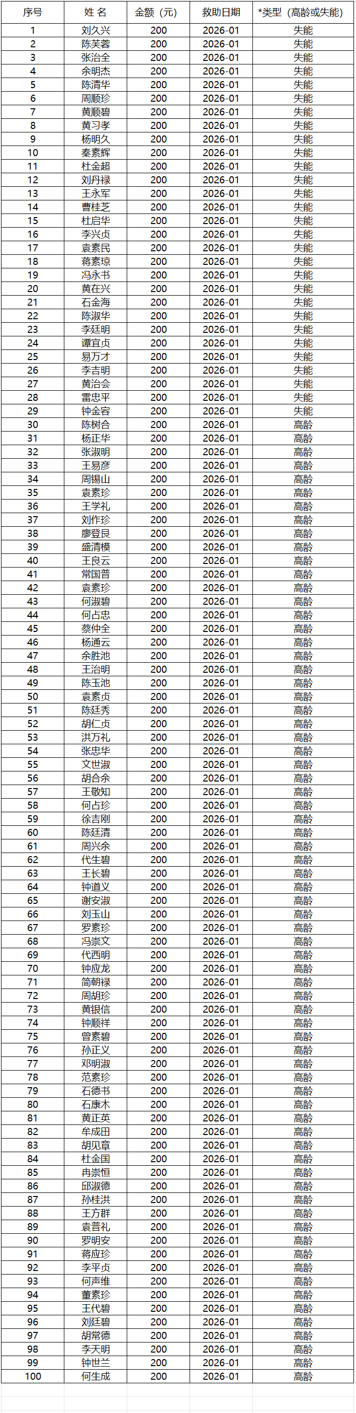 2026年1月涪陵区焦石镇经济困难高龄失能老年人养老服务补贴名单