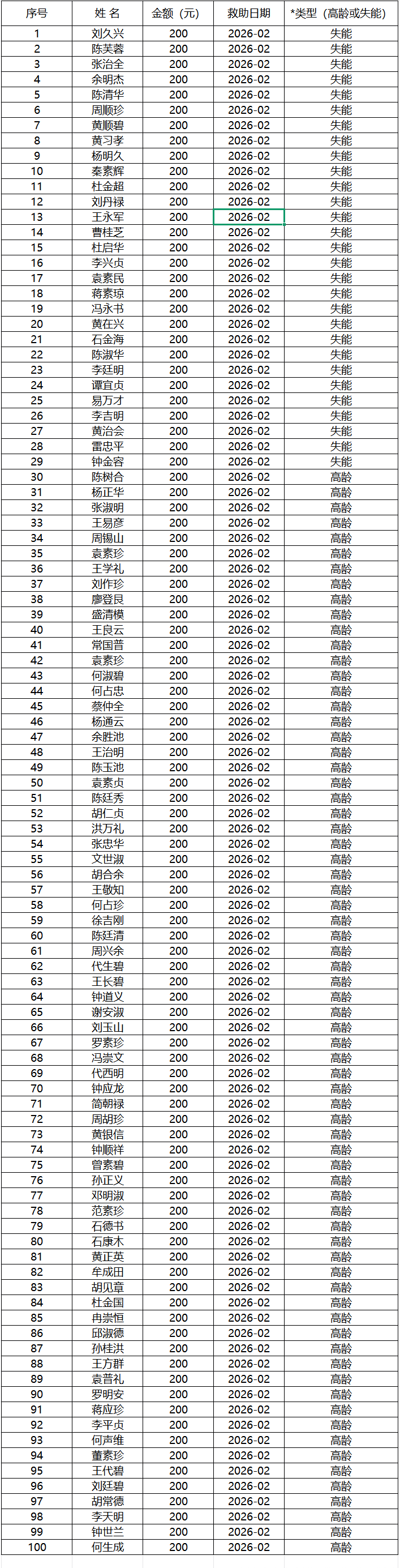 2026年2月涪陵区焦石镇经济困难高龄失能老年人养老服务补贴名单