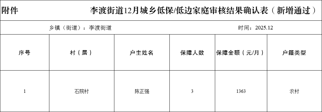 涪陵区李渡街道2025年12月低保人员新增公示