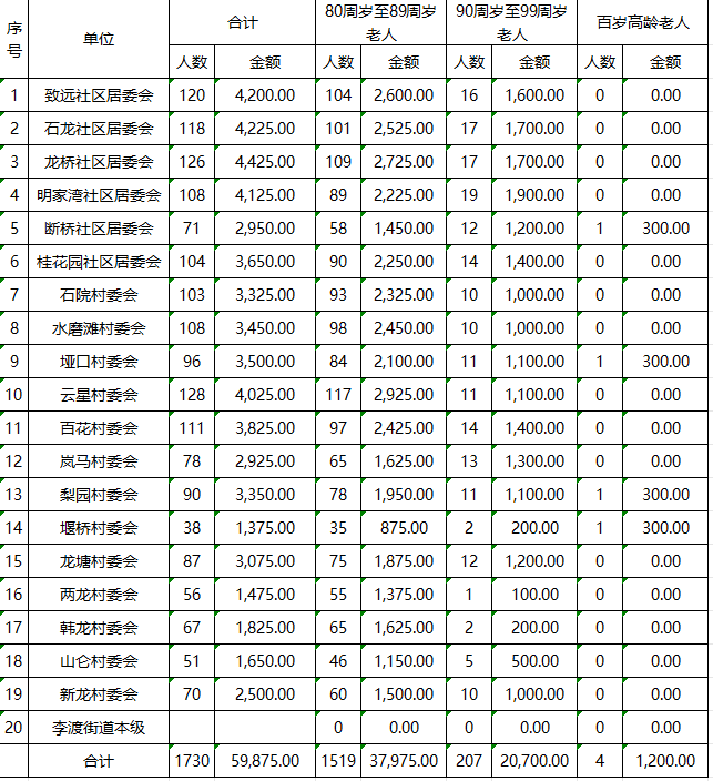 涪陵区李渡街道2024年8月高龄津贴发放金额汇总表