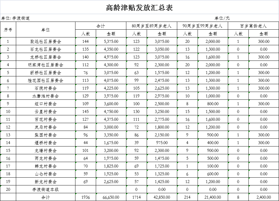 涪陵区李渡街道2026年1月高龄津贴发放金额汇总表