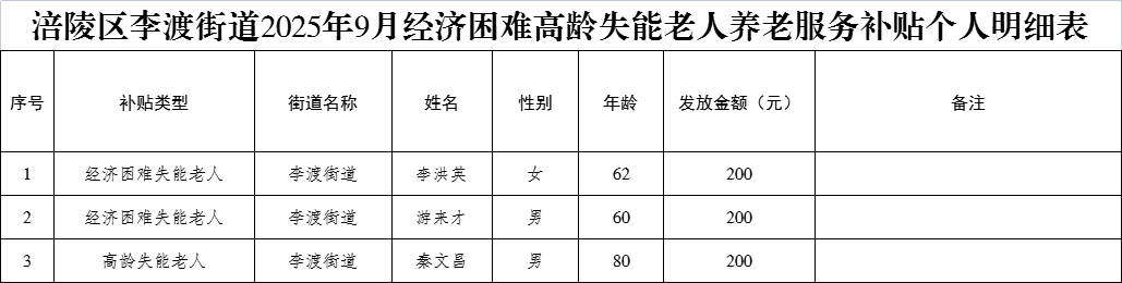 涪陵区李渡街道2025年9月经济困难高龄失能老人养老服务补贴个人明细表